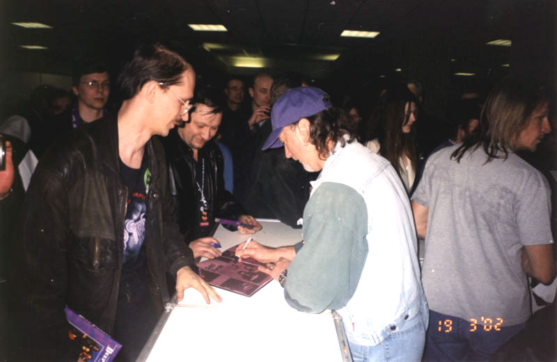Около 19:30 появились ОНИ. Вся группа в полном составе. Интеллигентнейшие, приятные и открытые люди. Фронт-мэн Иэн Гиллан блистал в своем светлом костюме, взяв на себя основной груз ответственности, Роджер Гловер, мгновенно рассмотревший в общей массе знакомые лица фэнов, Иэн Пэйс, снисходительно улыбающийся из-за своих очков на окружающую суету, сама любезность - Стив Морс, ну а улыбка Дона Эйри - это тема отдельного рассказа :-)