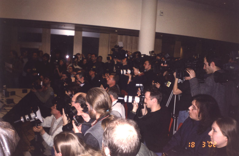 В зал набилось очень много народу, не менее 50-60 человек. Камеры громоздились друг на друга, стол оказался уставлен микрофонами с эмблемами вроде бы всех телекомпаний. Потом выяснилось, количество так и не перешло в качество, и показанные по ТВ сюжеты о пресс-конференции, можно пересчитать по пальцам на одной руке.