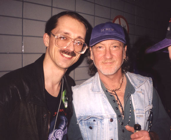 Затем появился наш старый друг - Роджер. Мне не доводилось встречаться с ним раньше, и все знакомство ограничивалось редкой перепиской по электронной почте. К моему изумлению, Роджер вспомнил наше хоть и долгое, но заочное знакомство, и мне удалось более подробно поговорить с этим замечательным человеком, который, выйдя в народ из-за барьера охраны, с удовольствием общался со всеми желающими. After Show: DZ and Roger Glover
